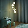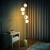 - A floor lamp with a metal base and stem, five light sources each encased in a glass globe shade. Fitted with a foot switch on a 180cm cable.