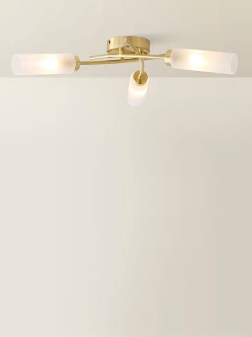 The Maya three arm flush ceiling light in brushed gold is a modern ceiling light in a flush design to save on headspace. Without having to save on style. A flush style ceiling light with three curved arms in a matte brushed gold metal with three long shades. A simple, modern design in a brushed gold finish that can add a perfect finishing touch to any modern home. The curving arms and long shades have an elegance to them that could enhance the décor in any room. A versatile piece well suited throughout the home. Perfect in kitchens, living rooms, hallways, bedrooms and home offices. Requires 3 x g9 bulb, max 1w. Personalise the lighting with your choice of warm, cool and smart bulb. Requires