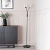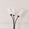 - A metal base floor lamp in a painted matte black finish. Three curved stems finished with three with long shades.