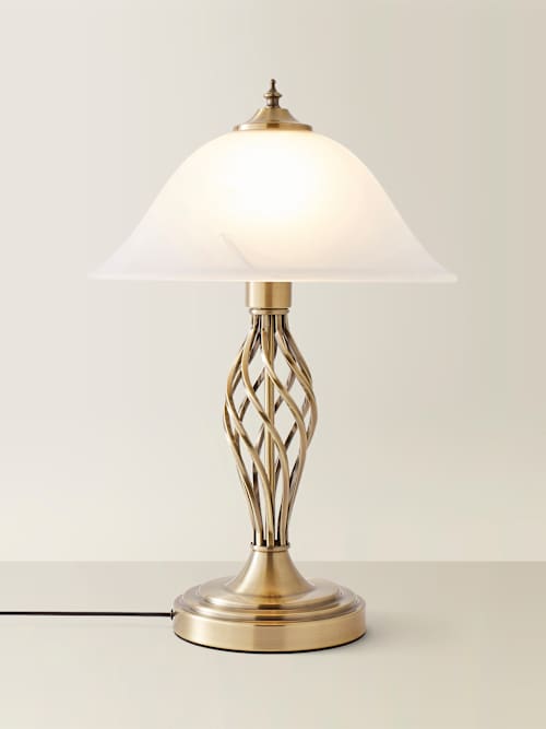 Vintage vibes and rustic charm come together in the perfect package with the Memphis antique brass twist table lamp. Its sleek brushed metal base and quirky barley twist design bring rustic charm to any room. The elegant, frosted glass shade makes this traditional table lamp perfect for cosy corners, stylish lounges, or hallway glow-ups. Just add an E27 bulb, and you're good to glow! Bonus: the inline rocker switch makes turning it on a total breeze. Classic style, modern ease, what's not to love?