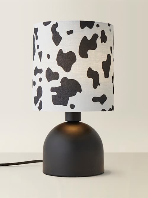 Miley is a table lamp that's udderly unique! Featuring a bold cow print design, this lamp brings a playful and funky touch to your space. With its quirky style, Miley is perfect for adding a bit of moo-d to your living room or bedroom. The black and white pattern creates a striking contrast, while the colour match cable keeps things coordinated. Whether you're looking to steer your decor in a new direction or just want something fun, Miley will have you making moooves!