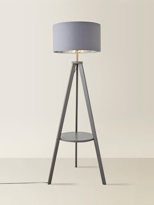 Morrigan is a grey wood tripod floor lamp that blends style and practicality with ease. Its built-in shelf is perfect for keeping your favourite book, a plant, or a cuppa close by, while the large grey shade features a stunning chrome interior and casts a soft, cosy glow across the room. With its cool tones and simple charm, Morrigan is just the thing to add character, light, and a touch of laid-back elegance to any living space.