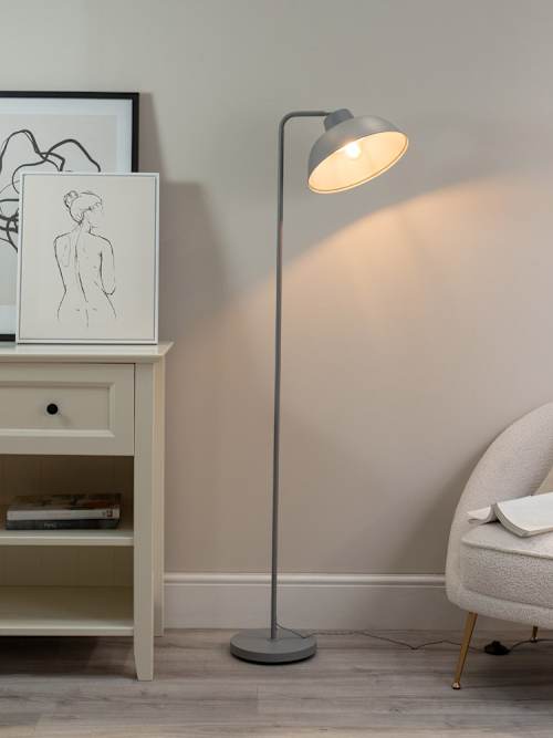 The morris dome shade floor lamp in grey is a midcentury industrial lamp design with a modern twist. The matte grey finish is what gives this timeless sillhouette its trendy twist. Perfect as a task light next to an arm chair or sofa, but really the morris will feel at home anywhere there's space. A dome shade all in one floor lamp made of a sturdy grey painted metal. Featuring a foot switch on a 18cm cable. A midcentury industrial style lamp with a dome shade in a modern grey colourway all the way through. Introduce a pop of colour or slot into your pre existing colour scheme. Perfect for tying together colour schemes or adding pops of colour to any living room, home office or bedroom.
