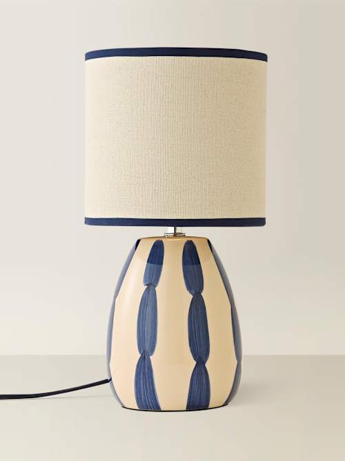 Buoy what a catch our Brynn table lamp is! With nautical but nice navy painted stripes against a soft cream background, the rounded ceramic base fits perfectly into a coastal aesthetic. Topping this maritime marvel is a cream linen shade, finished with navy trim top and bottom, that ties in with the stripes and colour-matched fabric cable for co-ord heaven. With Brynn by your side, it’ll be style ahoy, whether you place him on a bedside, side table or in a coastal cosy reading nook.