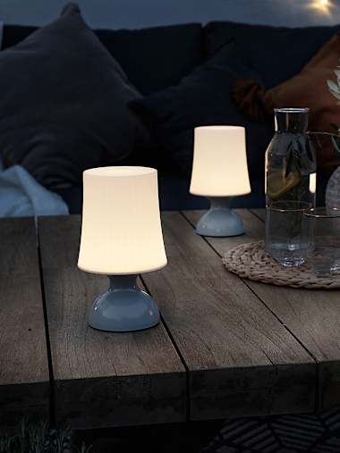 Rechargeable, battery operated and solar powered are the three options you’ve got for portable lamps. If they’ve got an IP rating of 44 or higher then they’re safe for outdoor use, check out our blog on IP ratings for more info on weather safety. Take your pick from lantern styles, LED candles and table lamps (to name the main styles, but there’s always more if you go digging).
