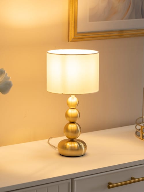 A modern touch, that's for sure. The marissa table lamps in brushed gold have a stacked design which will add some design interest to your space in a subtle way. Perfect for bedsides. A pair of table lamps in a stacked design and fabric shade. A pair of matte black table lamps with a stacked globe design. Bring in a simple, modern design with a geometric feel. Add a pop of brushed gold to your space or tie all your gold finishes together with this modern design. Perfect for living rooms, bedrooms, dining rooms or hallway tables. Requires 1x bulb, personalise your lighting with your choice of warm, cool or smart bulb. All bulbs are led by default. Doesn't require installation, just plug