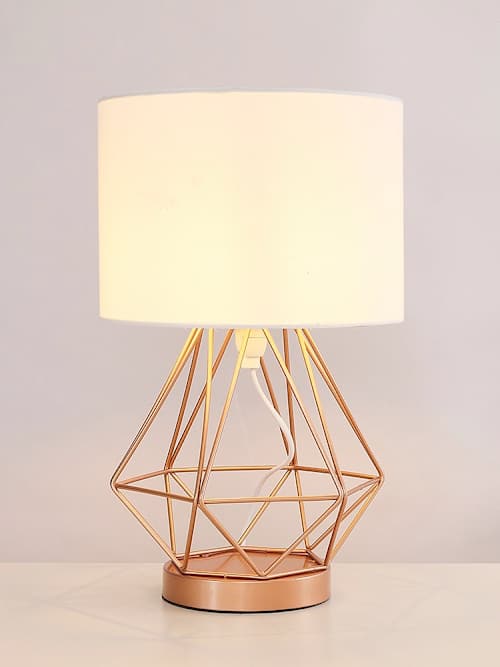 Pair of Melrose Copper Touch Table Lamps with White Shades. These striking industrial table lamps are ideal for any contemporary or minimalist home. Touch the base to activate the 4 stage dimmer: on, low, level dim light, medium light, bright light and off. Ideal as bedside table lamps, or for additional lighting in a hallway or living room. Requires 2 x 5W dimmable LED bulbs