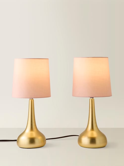 Double the glow, double the charm. This pair of teardrop touch lamps brings effortless warmth to any space, with smooth metallic gold bases and soft pink shades that glow beautifully. Tap to dim, tap to brighten, tap just because. The touch control makes mood-setting irresistibly easy. Perfect for bedside symmetry, living-room glow-ups or anywhere that could use a little sparkle in twos.