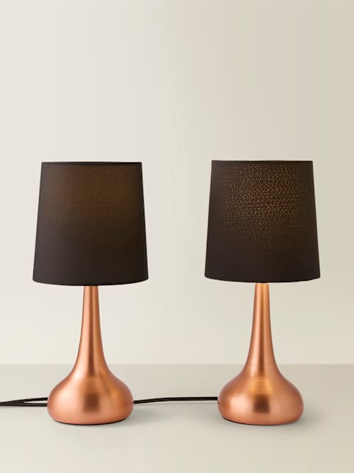 Double the glow, double the charm. This pair of teardrop touch lamps brings effortless warmth to any space, with smooth metallic copper bases and classic black shades that glow beautifully. Tap to dim, tap to brighten, tap just because. The touch control makes mood-setting irresistibly easy. Perfect for bedside symmetry, living-room glow-ups or anywhere that could use a little sparkle in twos.