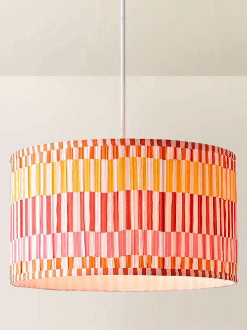 Brighten your space with Rae, a pleated lampshade bursting with warm stripes in red, orange, and golden tones. Available in small or large, it features a colour-matched inner and easy-fit design for fuss-free styling. Whether it's lighting up a cosy corner or making a statement from the ceiling, Rae adds a splash of sunshine and texture to any room. It's bold, it's beautiful, and it's ready to glow! Our shades come with a 4cm opening for E27 lamp holders, and we’ve added a handy reducer ring that brings it down to 3cm so it’s E14 friendly too.