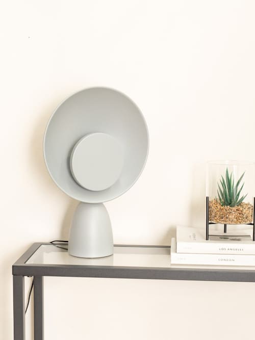 The Saffy LED table lamp in grey is a modern table lamp with integrated LED technology. It's got a conical base with a two disc style shade. A metal table lamp with integrated LED technology featuring a rocker switch on a convenient 18cm cable. A modern, innovative design that will add the wow factor to any contemporary home. With a sculptural design that acts as a functional light and a statement piece of décor. Perfect for bedside tables, hallways, living rooms, home offices or anywhere that needs a little glow. This table lamp is an integrated LED design which means you don't have to worry about finding its perfect bulb.