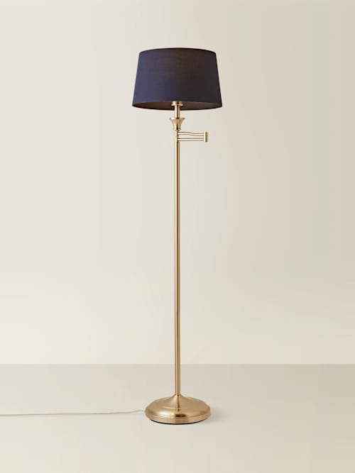 Sinatra Brushed Chrome Floor Lamp with Navy Blue Aspen ShadeThis traditional swing arm floor lamp is a gorgeous addition to any living or bedroom spacePerfect for illuminating any dark cornersPlease note that the base requires full self, assemblyRequires one 6W ES/E27 bulb or LED equivalent