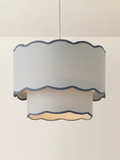 The Sloane two-tier scalloped shade is all about standout design with a twist. Featuring two scalloped tiers and a bold contrasting trim in grey, this shade delivers retro-inspired charm with a modern edge. Ideal for anyone who loves colour and character, Sloane transforms your ceiling into a chic focal point. Perfect for living rooms, bedrooms, or dining spaces that deserve a little extra personality. Our shades come with a 4cm opening for E27 lamp holders, and we’ve added a handy reducer ring that brings it down to 3cm so it’s E14 friendly too.