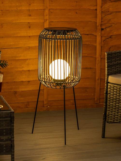 Brighten up your space and your mood with this solar rattan tripod floor lamp. Perfect for adding a touch of boho charm, making it a showstopper by day and a soft glow machine by night. The sleek rattan lantern design lamp stands tall on its 3 tripod legs and there's a globe shaped bulb housed inside the lantern. No wires, no fuss, just sustainable style that'll have your garden shining with eco-friendly vibes. Let the sunshine in!