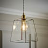- A classic glass pendant shade with a display case style with antique brass details. Try using a filament bulbs for the full effect.