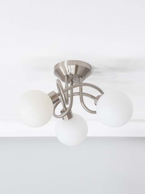 The velika three arm flush ceiling light in brushed chrome is a great way to add a lot of light and a bit of glimmer to any room. The flush design keeps things understated whilst the glass globes add the style. Semi flush, three arm design ceiling light with metal ceiling plate and arms and glass globe shades. A semi flush three arm ceiling light with metal ceiling plate and arms in brushed chrome, finished with glass globe light shades that bring a midcentury feel to any space. The perfect way to tie together a colour scheme and add some depth to your lighting scheme. Suitable for living spaces, bedrooms, hallways and dining areas. Requires 3x g9 bulb, max 1w. Personalise your home lighting