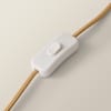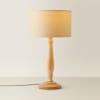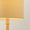 - A freestanding, wooden table lamp base perfectly paired with a natural drum shade.