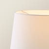 - A freestanding, wooden floor lamp base perfectly paired with a white tapered shade.